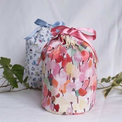 まずはリバティプリント生地のものを2点。リバティはやっぱりさすがなのです。色使いもとびきり美しいし、繊細な絵柄が芸術品のようで眼に楽しく、ついつい延々と眺めてしまいます。