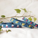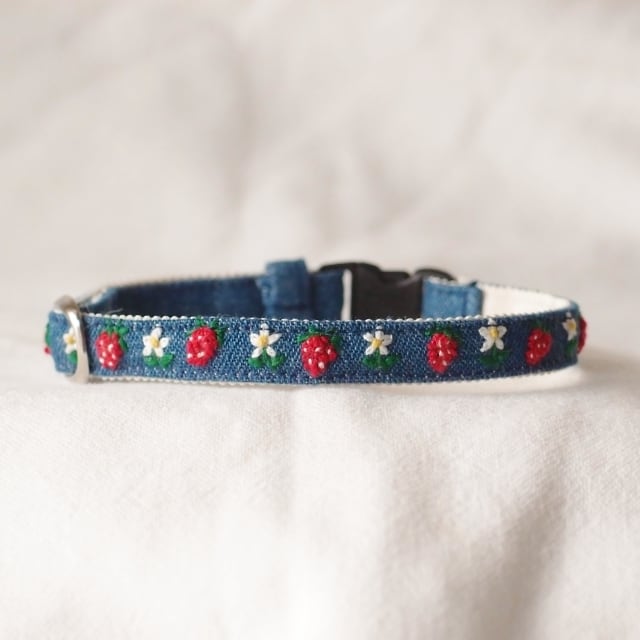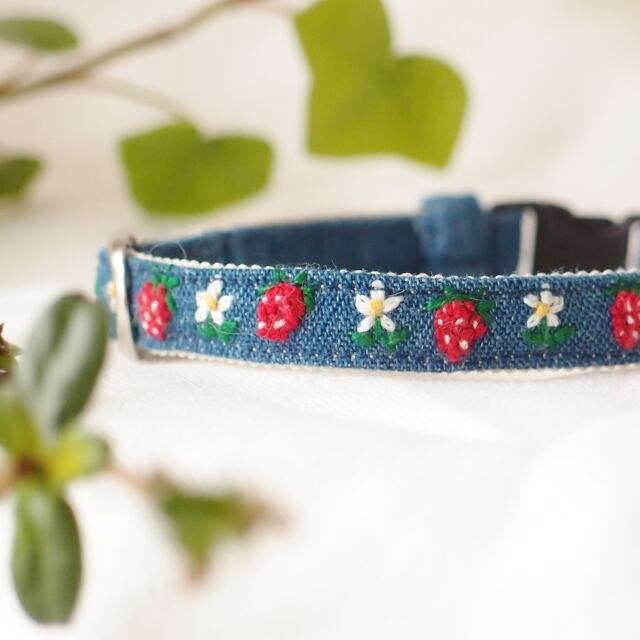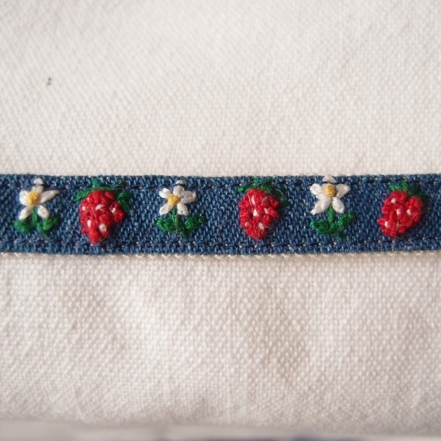 デニム地に赤いイチゴと白い花を並べたら、元気な子によく似合いそうな愛らしいお品になりました。赤、白、緑がデニム地によく映えて、個人的にとても好きな一品です。