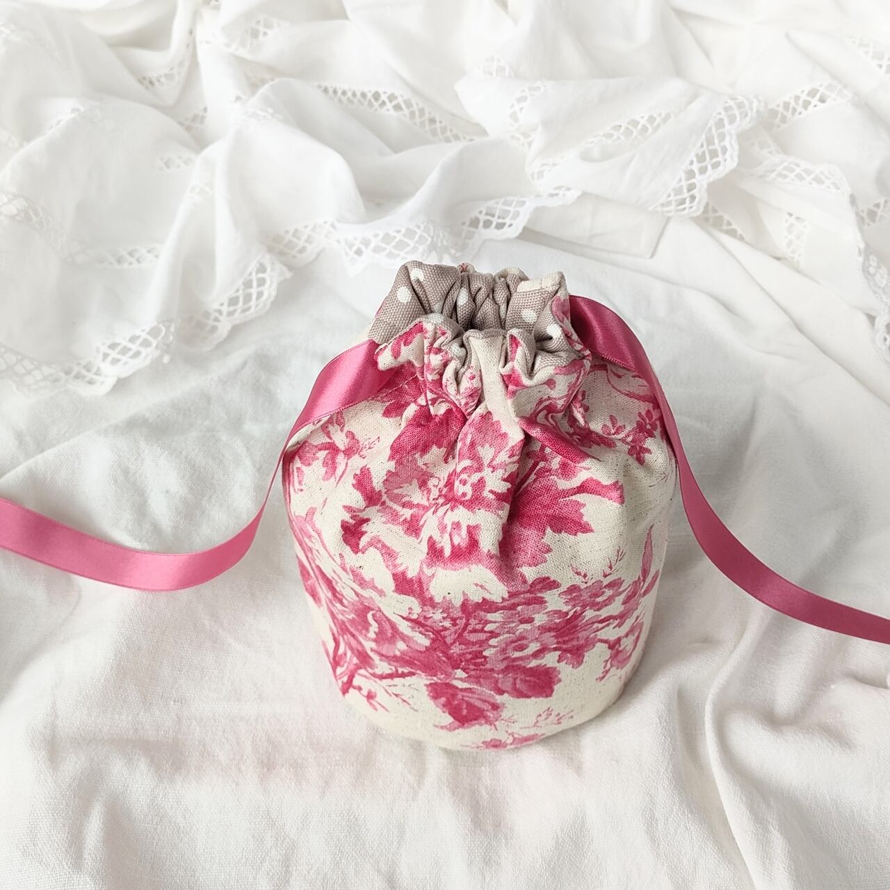 裏地はグレーベージュにオフホワイトのドット柄、リボンはバラ色のサテンです。