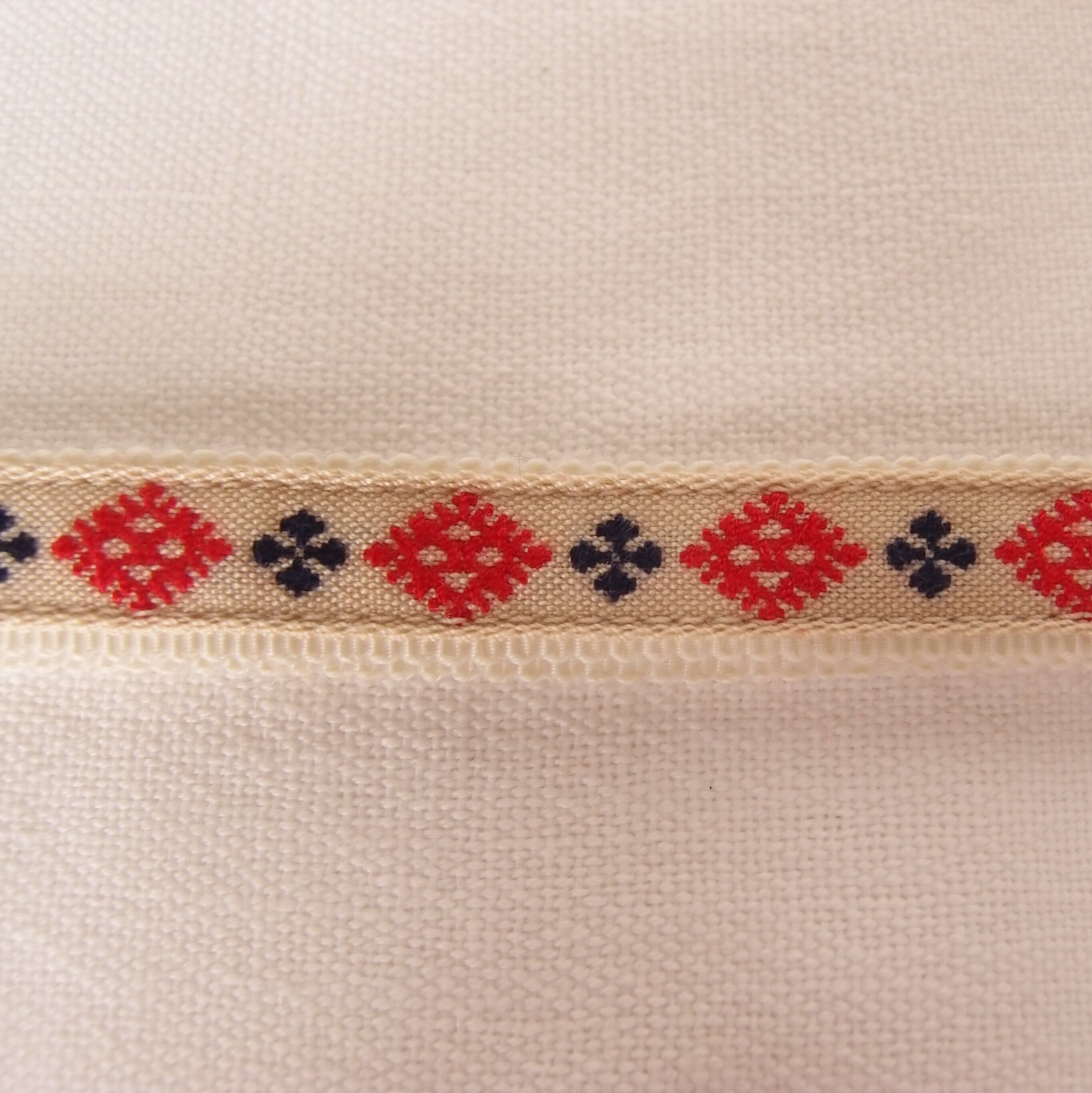 こちらはゴールドベージュ地に赤とネイビーの機械刺繍です。