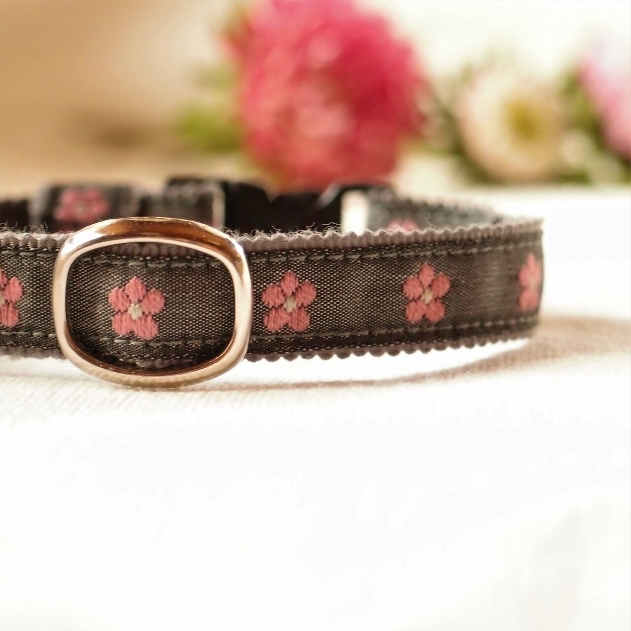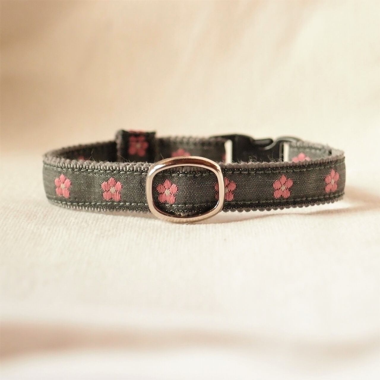 当店の人気商品、夜会のイブニングドレスという首輪の色違いです。光沢のあるチャコールグレー地にくすみピンクのお花の組み合わせ。