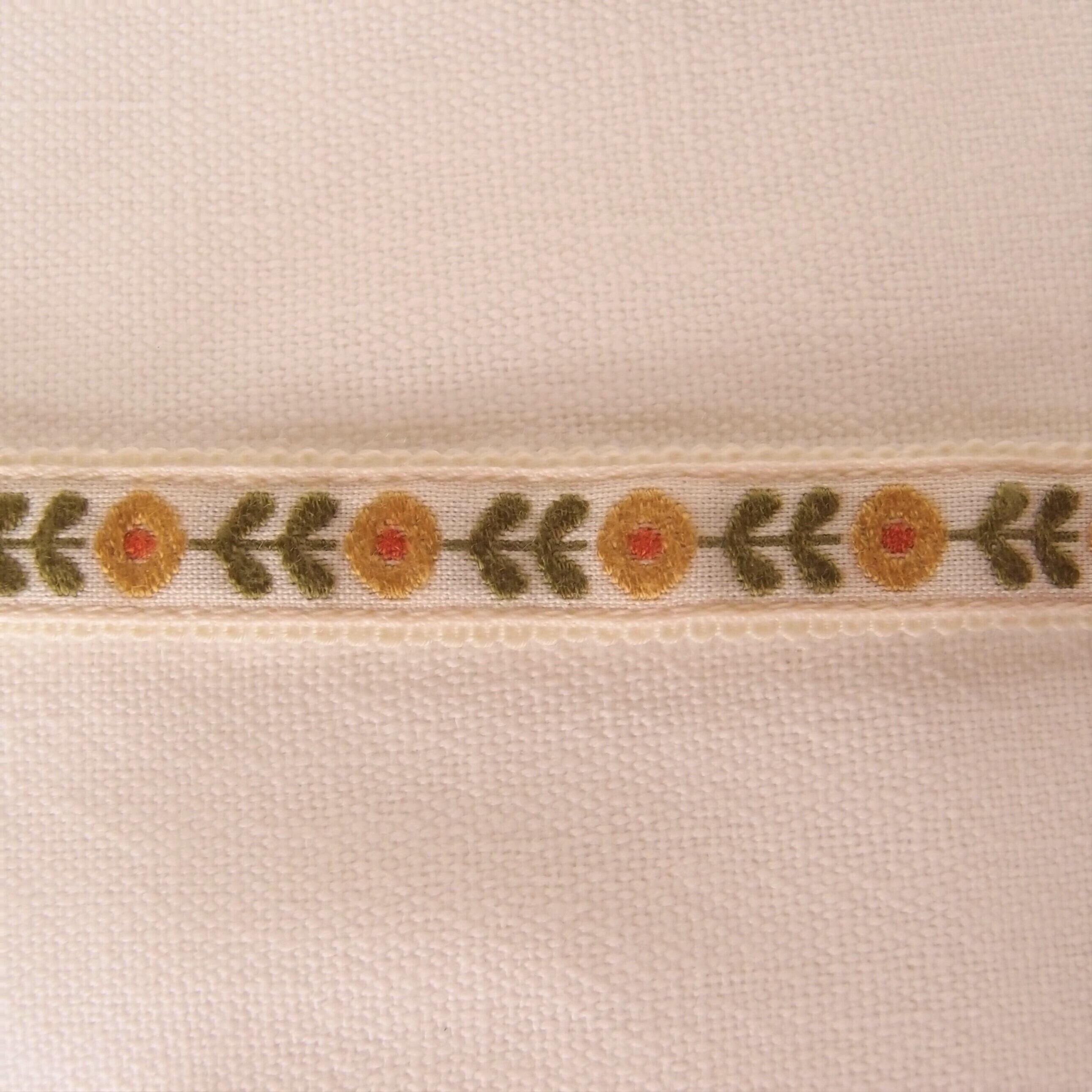 2色ご用意しました。どちらも色とデザインが引き立てあっていてそれはそれは素敵です。こちらはクリーム色の地にミモザの黄色、くすみオレンジ、カーキの機械刺繍。
