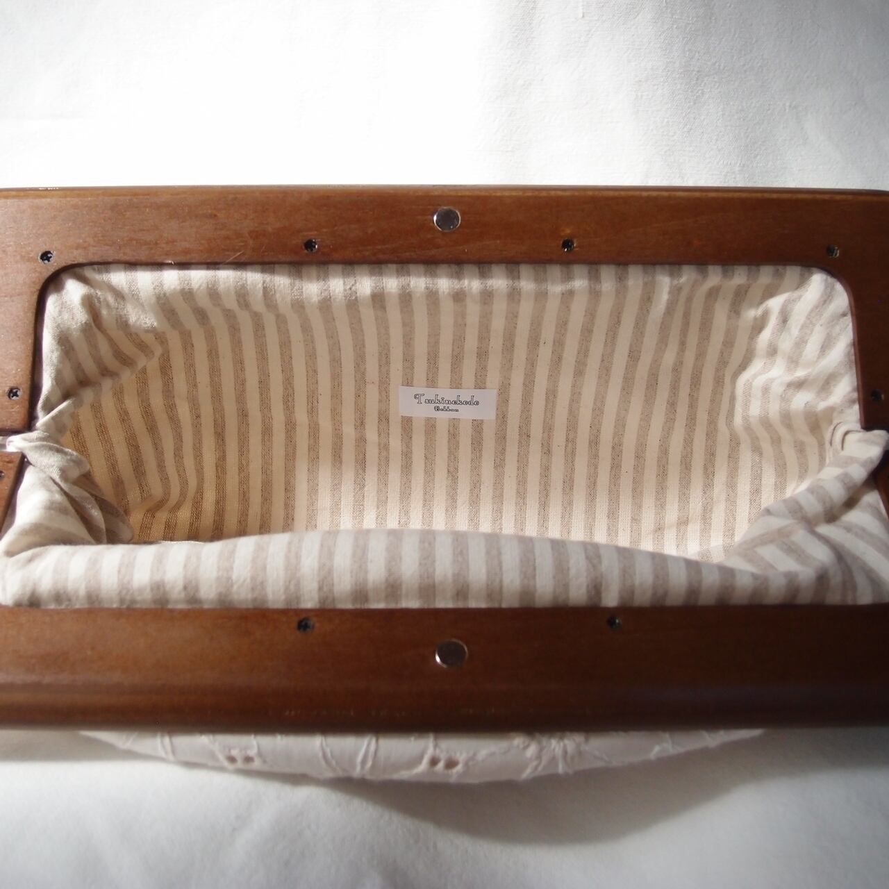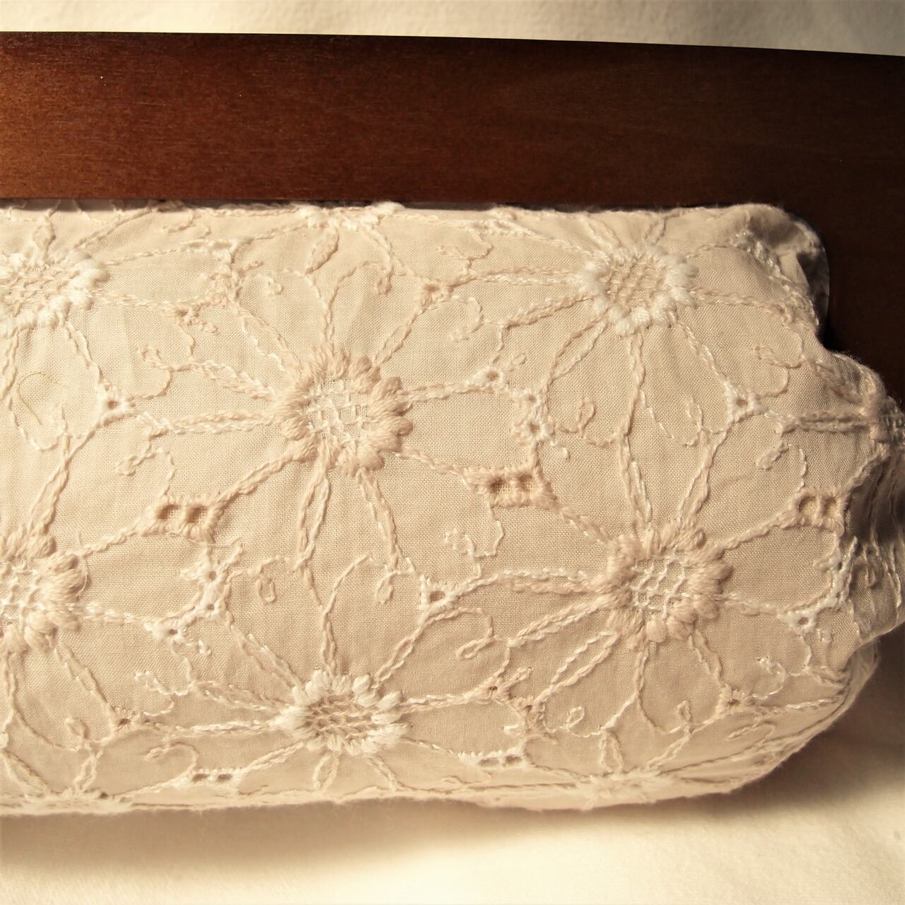 こちらはライトベージュの生地に同色とアイボリーの2色の糸で一面に花を機械刺繍した生地。裏張りは生成りとサンドベージュのストライプ。
