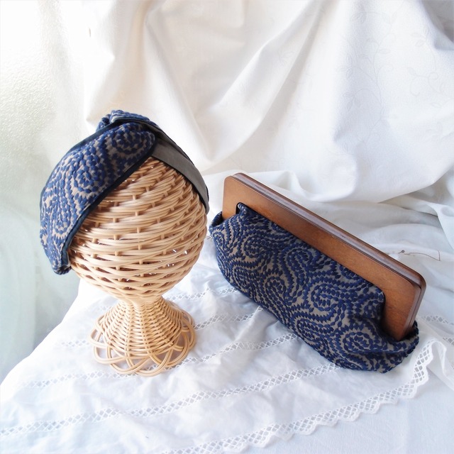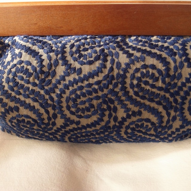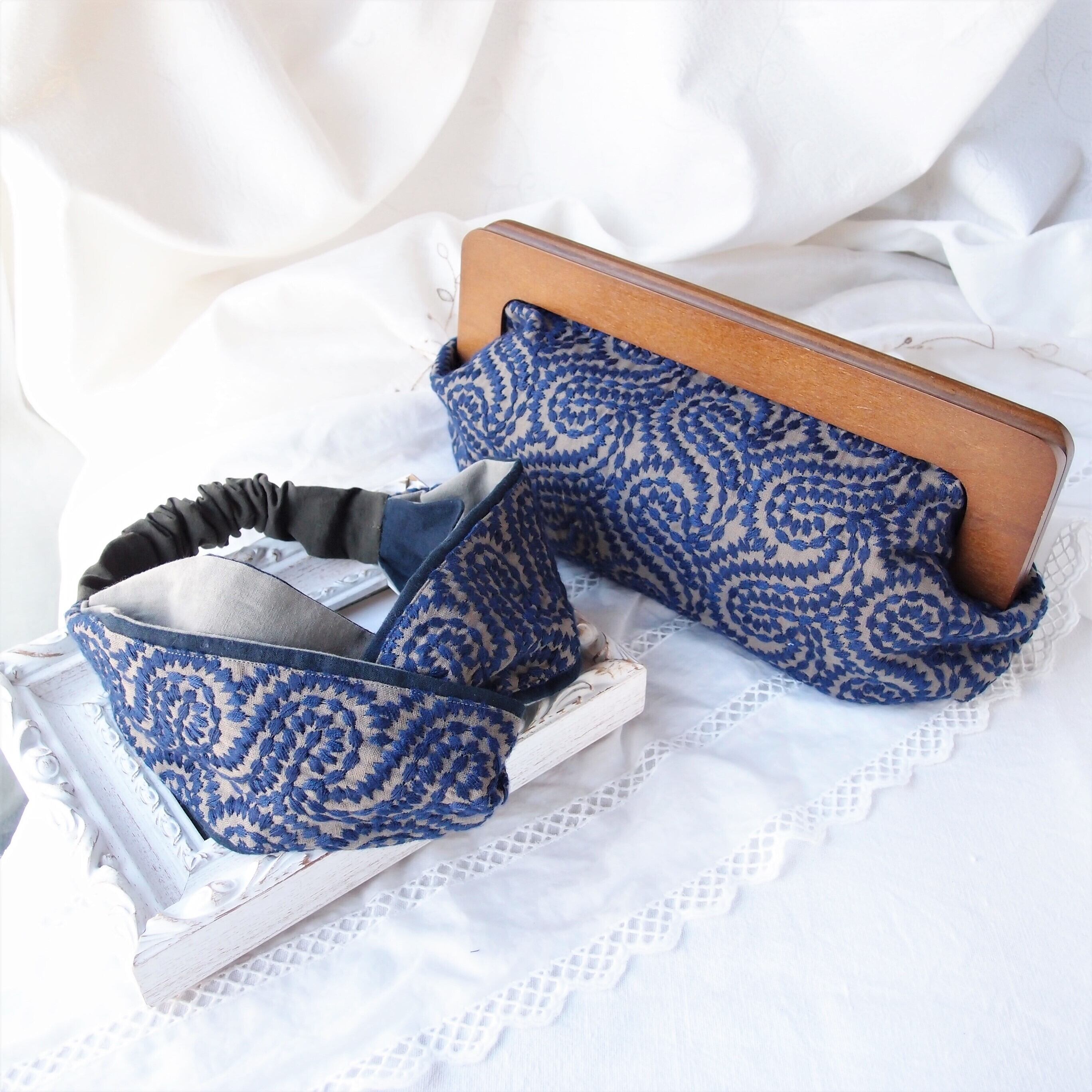こちらはカーキグレーの地にブルーとネイビーの濃淡でツタのような美しいラインをぐるぐると機械刺繍したかっこいい生地。裏張りは裏張りは心なごむ若草色。