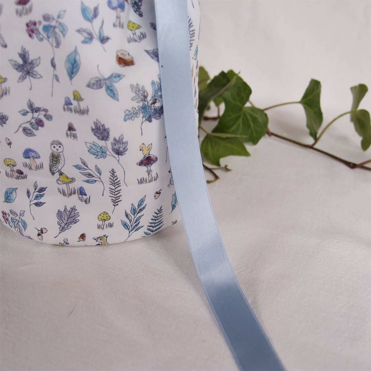 リボンはアイスブルー、裏地はアイスブルーと白のストライプ。赤ちゃんのベッドリネンを連想して選びました