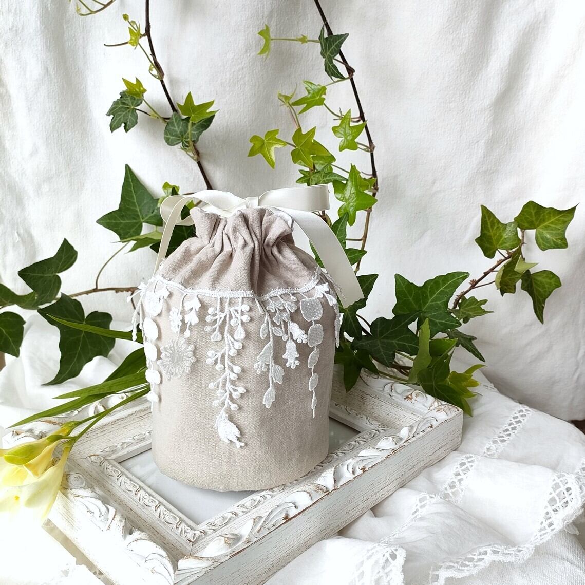 光沢のある白い糸で編まれた繊細なレースをコットンリネンの生地にあしらいました。