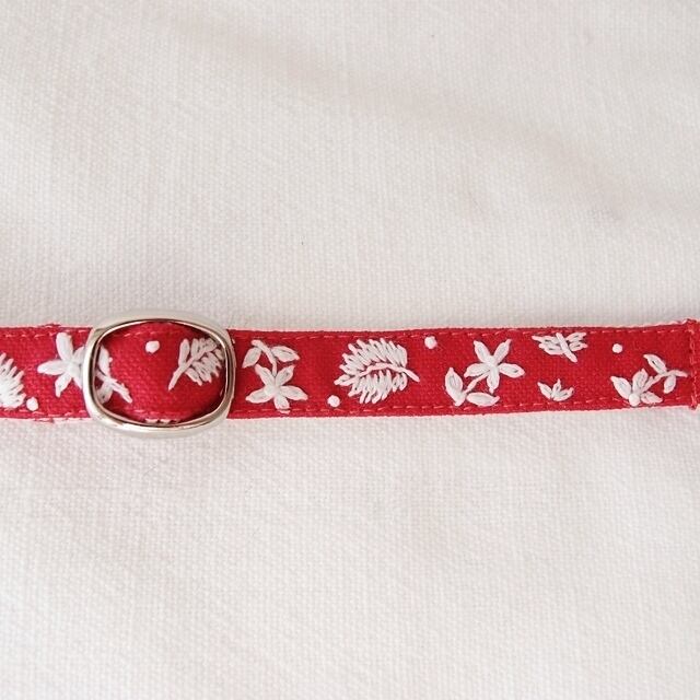 クリスマスローズとシダのモチーフをピュアホワイトで手刺繍した美しい真紅の首輪です。