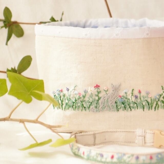 可憐な野の花が咲き乱れる原っぱにグレーの猫の後ろ姿の手刺繍をほどこしました。内布はブルーのギンガムチェック、縁取りは白のカットワークレースです。